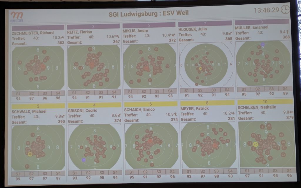 Aber wir hatten noch die letzte Chance zum Sieg am Sonntag gegen den etwas leichteren Gegner Ludwigsburg. Entsprechend der hohen Motivation und dem guten Teamgeist versuchte jeder nochmals sein Bestes zu geben. Das gelang an Position 1 unserem Michael Schwald besonders gut. Er startete gleich mit einer 99-Passe und sein Ergebnis mit 390 Ringen war sein bestes in dieser Saison. Cédric Grisoni und Enrico Schaich legten einen durchschnittlichen Wettkampf hin und beeindruckten gerade zum Schluss ihre Gegner, sodass es zum Sieg reichte. Auch Patrick Meyer an Position 4 gelang wieder ein richtig guter Wettkampf mit 381 Ringen. Große positive Überraschung bot unsere Nathalie Schelken an Position 5. Sie startete mit einer 97-Passe und konnte den ganzen Wettkampf gut durchziehen. Mit ihrem Ergebnis von 379 Ringen bestätigte sie ihre Bundesliga-Bestleistung.