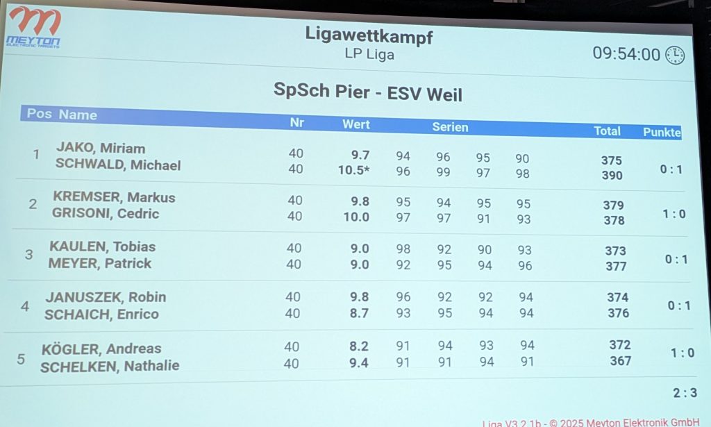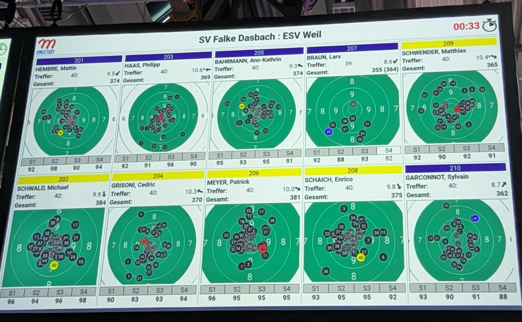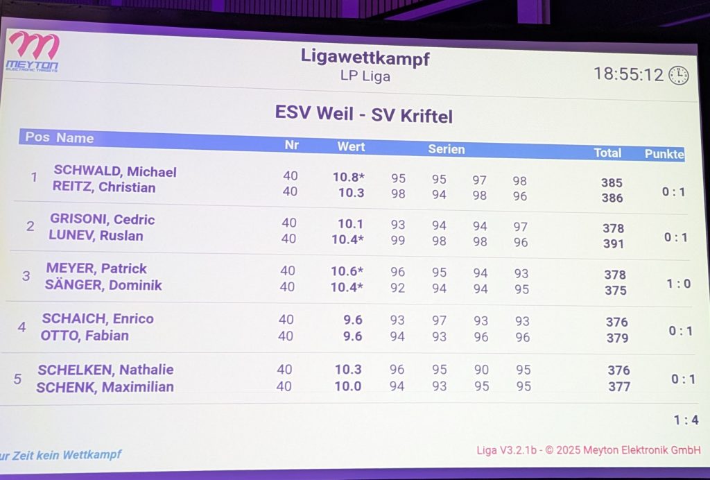 Am Schluss ging der Sieg mit 4:1 nach Kriftel. Der ESV Weil am Rhein erzielte eine Gesamtringzahl von 1893 Ringen. Der SV Kriftel mit dem Finalbestergebnis von 1908 Ringen.